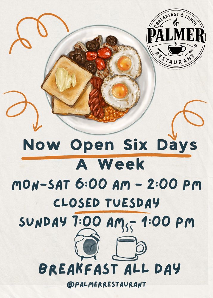 At Palmer Restaurant, we believe breakfast is more than just a meal, it's an experience. Join us for a cozy atmosphere, friendly faces and the best cup of coffee in town. Come on in and make your mornings memorable with us! We can't wait to serve you soon!